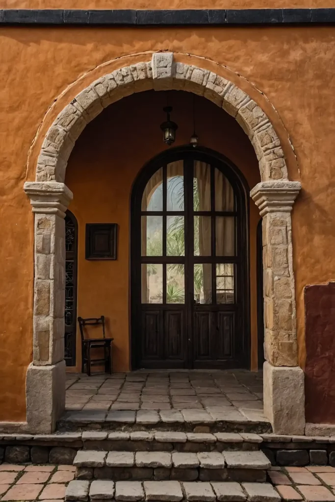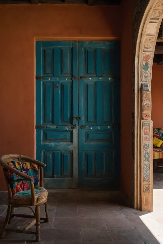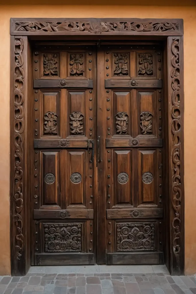 Install massive wooden doors featuring traditional Mexican carving patterns and hardware.
