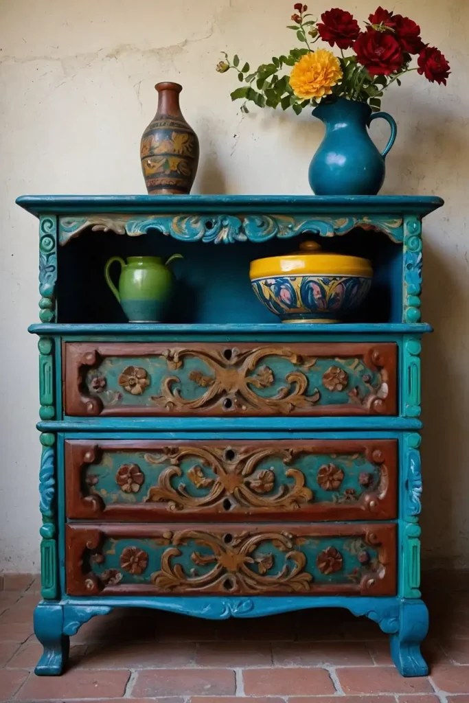 Use milk paints or lime washes for authentic finishes. Mexican painted furniture celebrates handcraft over machine perfection.