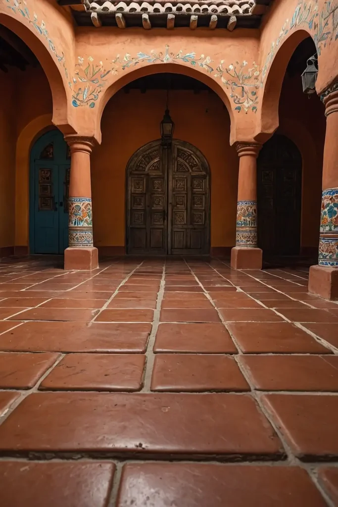 Saltillo tiles from Mexico provide traditional orange-red coloring. These natural materials feel cool underfoot and improve with age and use.