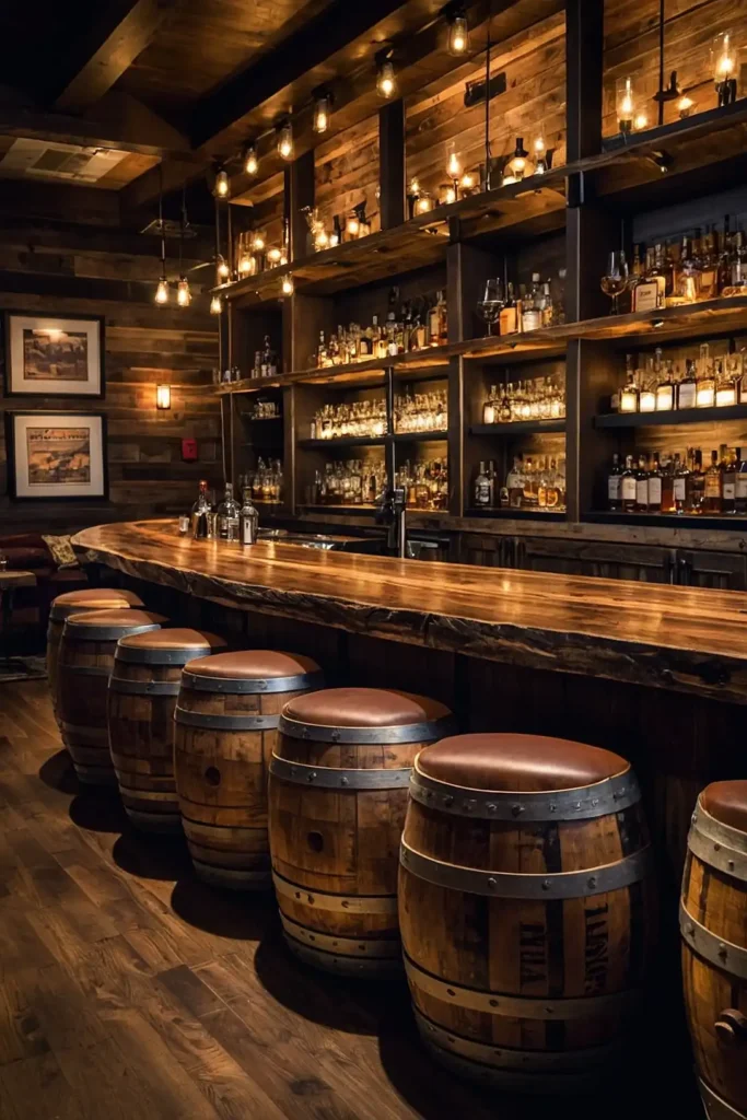 Install floating shelves on the accent wall for bottle display. The contrast between smooth bottles and rough wood creates visual interest.