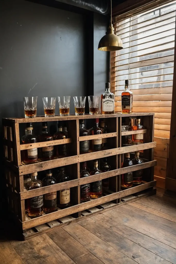 Repurpose authentic whiskey crates as functional storage and decorative elements.