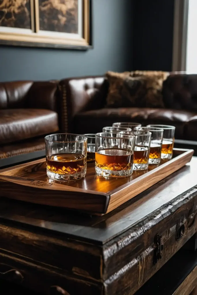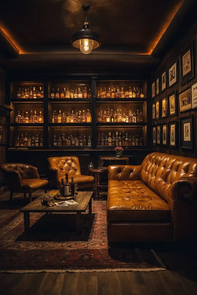 Add a fireplace or electric heater that creates warmth and visual focal points. The dancing flames complement whiskey’s warming properties perfectly.