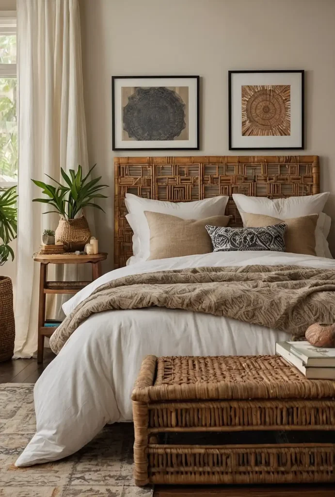Choose a cane or rattan headboard for natural texture and warmth. These materials add bohemian character without bold colors.