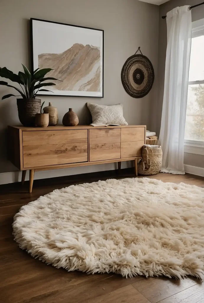 Choose natural fiber shags like wool or cotton. These materials feel soft underfoot while maintaining neutral tones.