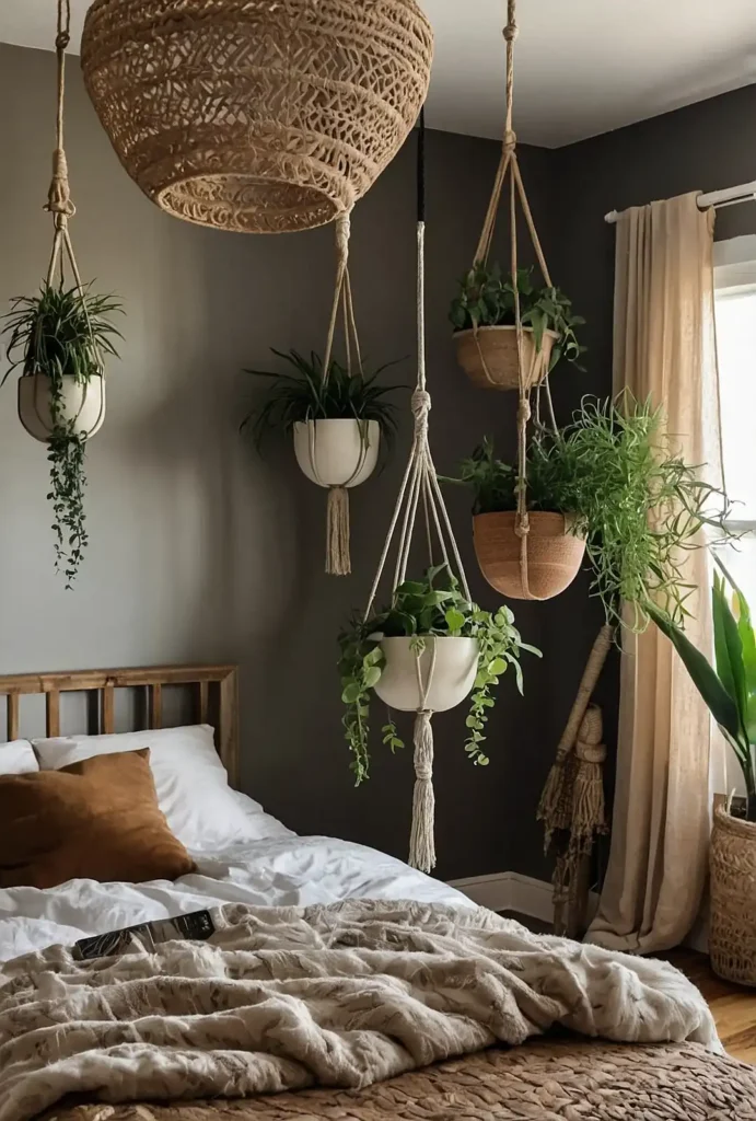 Position hangers at varying heights for dynamic visual appeal. Natural rope or macrame plant holders enhance the look.