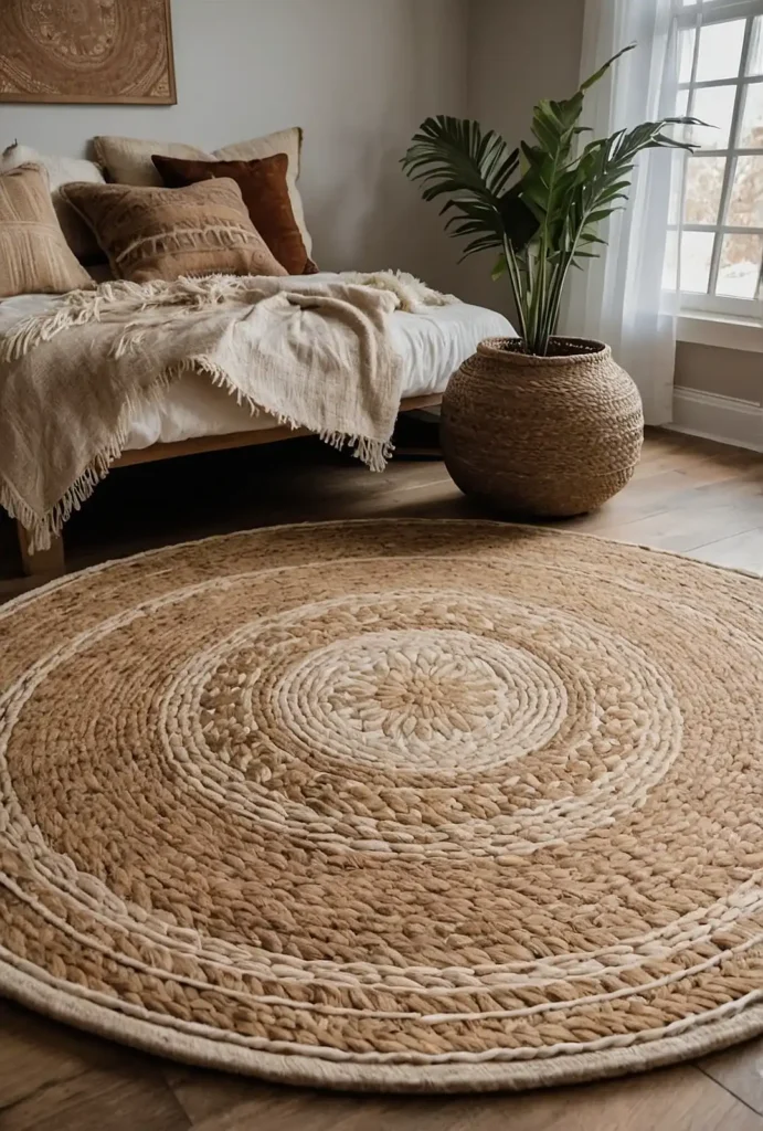 Anchor your space with a large jute area rug in natural fibers. Choose round or rectangular shapes based on room layout.