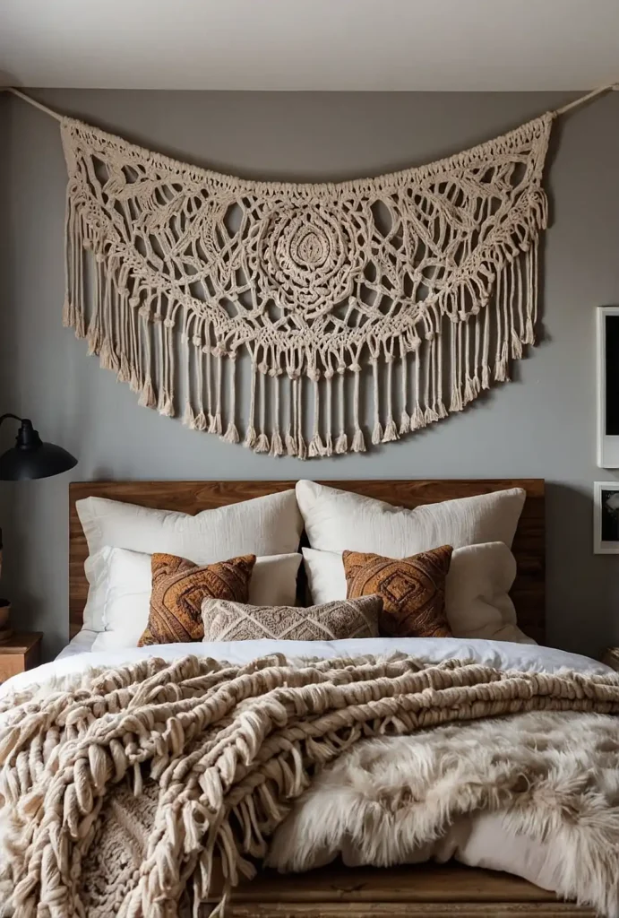 Install a large macrame wall hanging above your headboard. Choose natural cotton cord in cream or ivory tones.