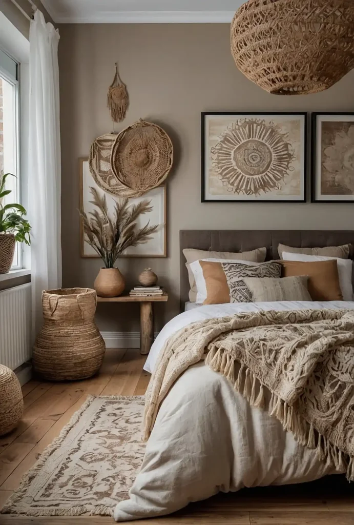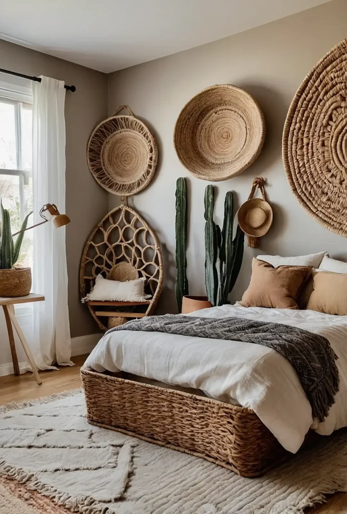 Arrange a collection of woven baskets on your bedroom wall. Choose natural materials like seagrass, rattan, or palm leaf.