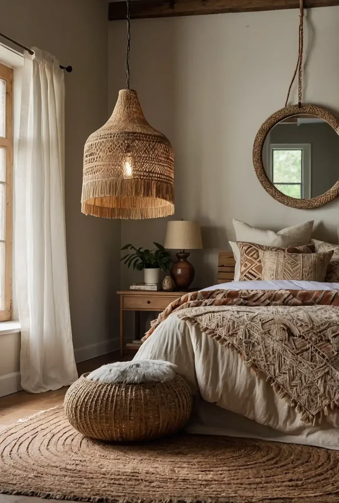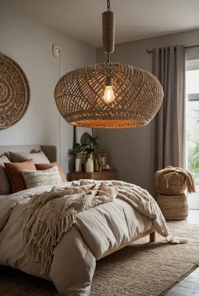 Install a woven pendant light as bedside illumination. Choose natural materials like rattan, bamboo, or hemp rope.