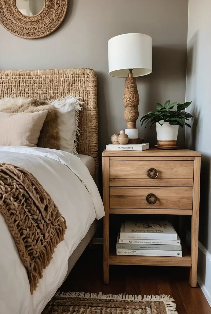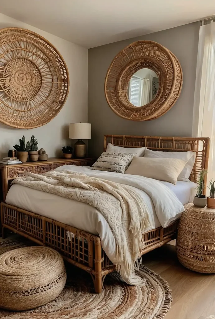 Incorporate rattan nightstands, chairs, or storage baskets throughout your bedroom. These natural pieces add warmth and texture.