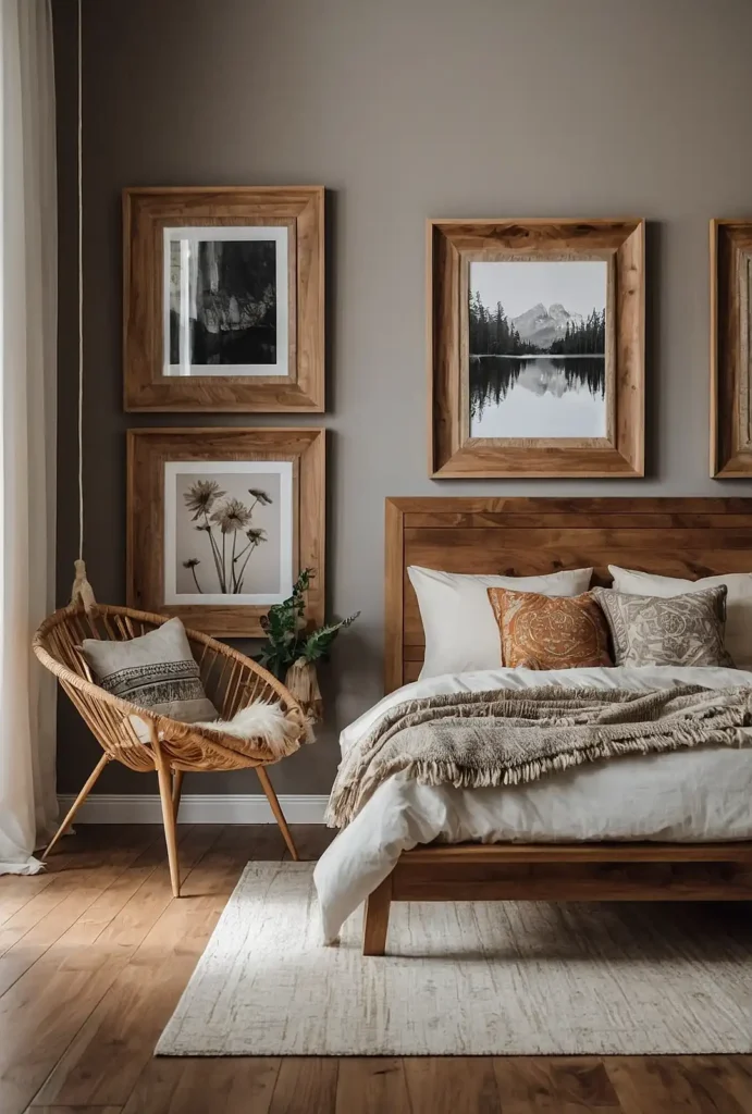 Mix frame sizes while maintaining consistent wood tones. This creates cohesive gallery walls with organic warmth.