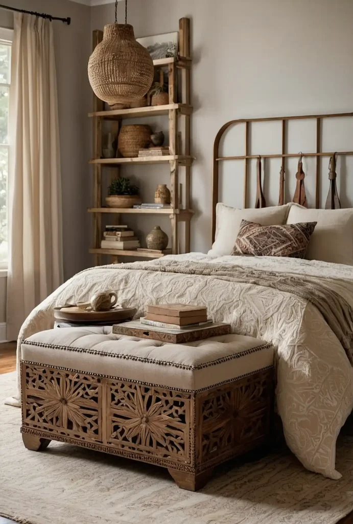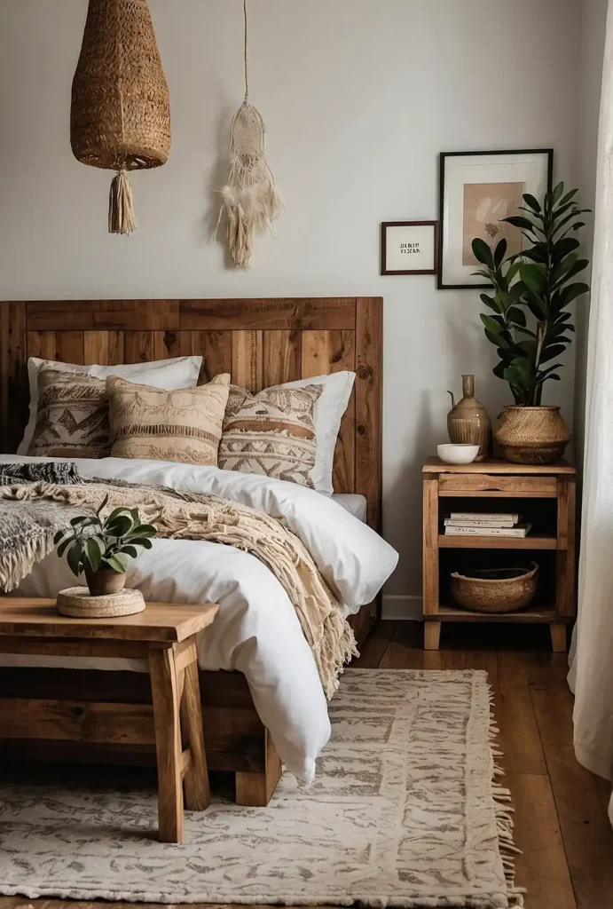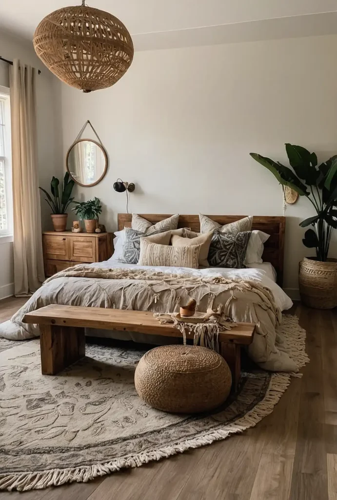 Place a wooden bench at the foot of your bed for seating and storage. Choose reclaimed wood or natural finishes.