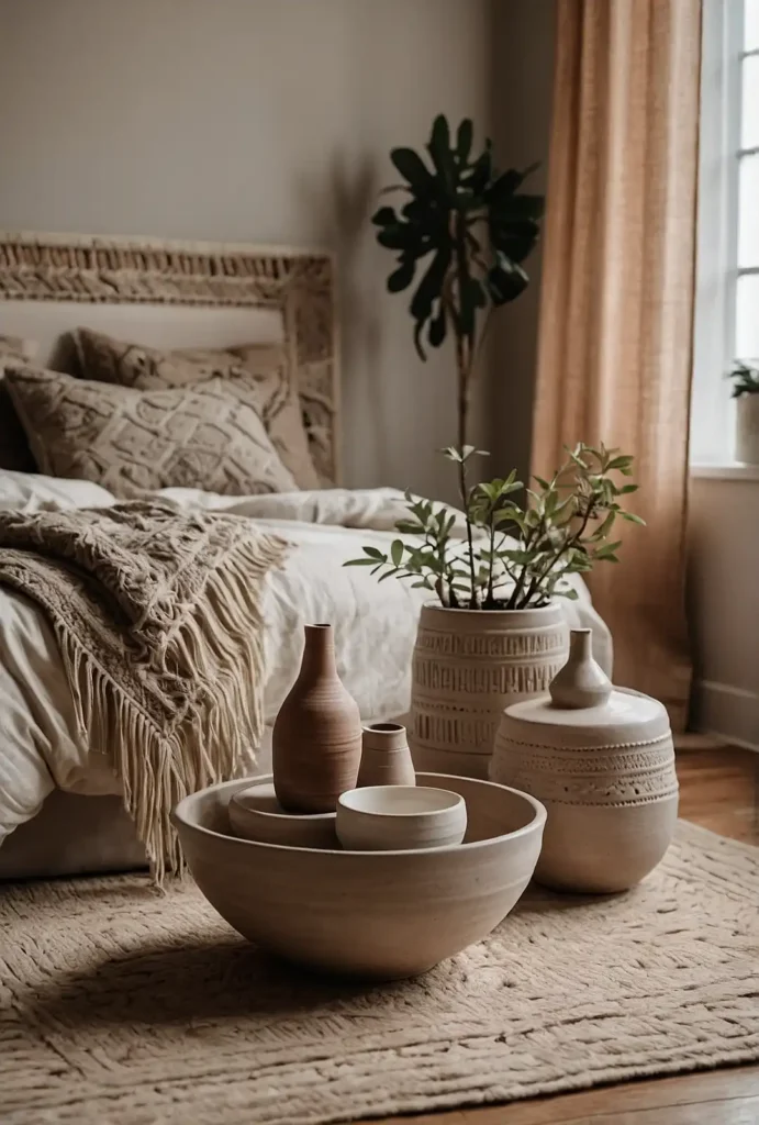 Display ceramic vessels in neutral glazes throughout your bedroom. Choose pieces in cream, beige, and soft brown tones.