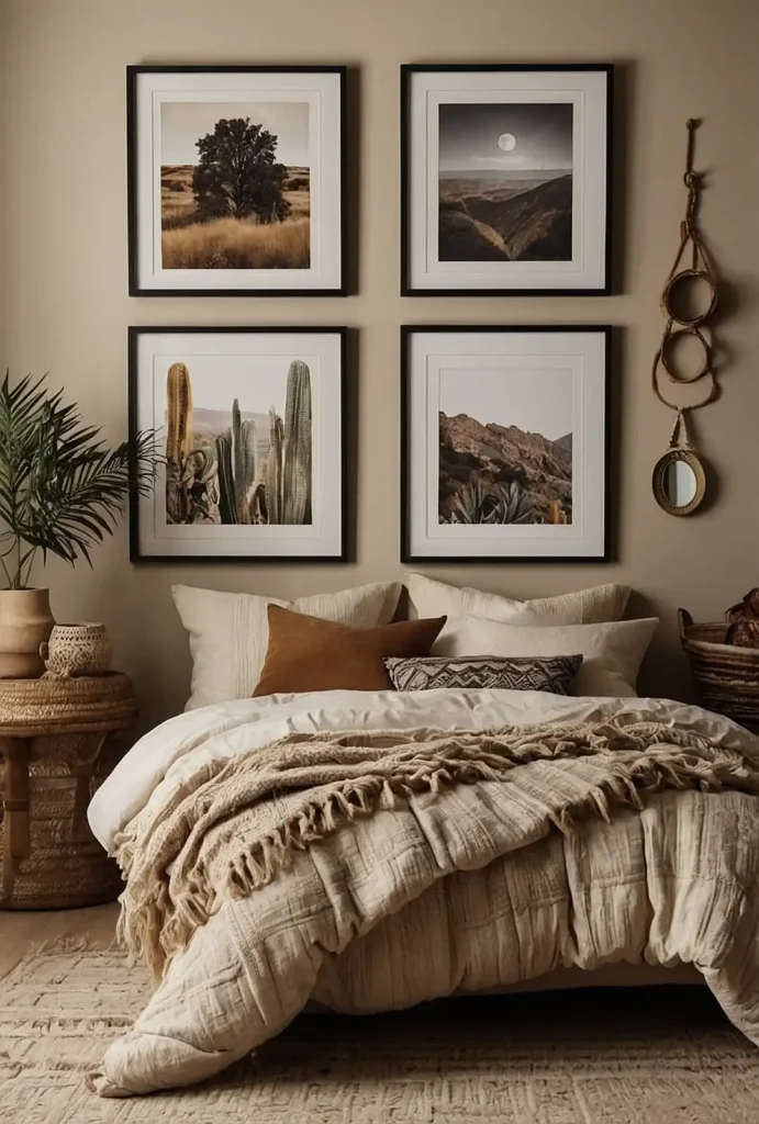 Select art with earth tones and organic shapes. This maintains color harmony while adding visual interest.