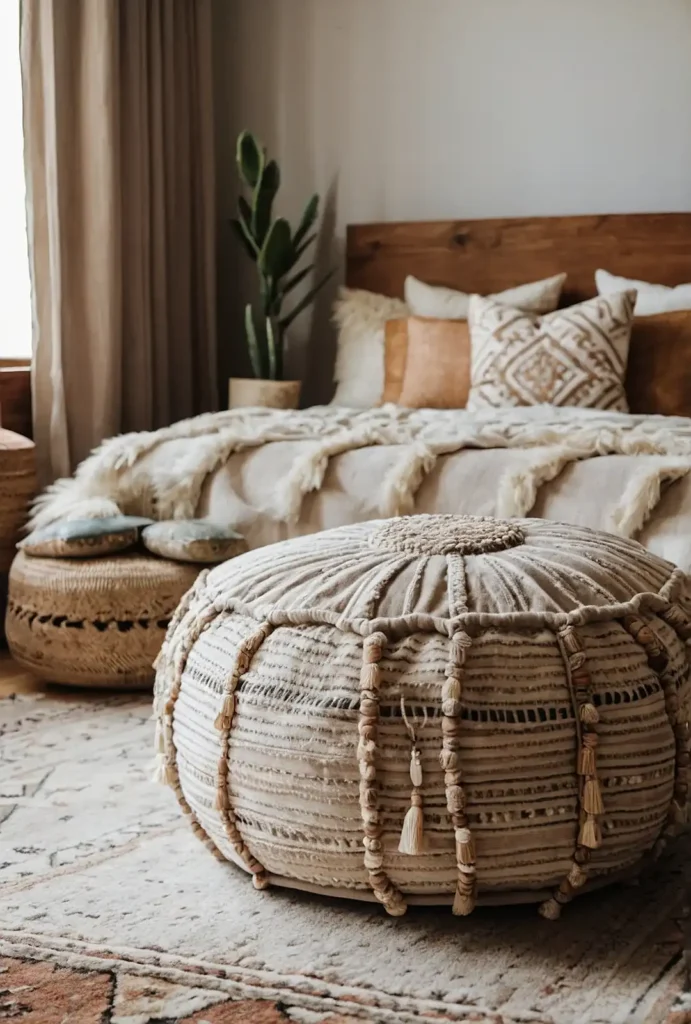 Add a Moroccan-style pouf in cream or natural leather. These versatile pieces serve as seating, footrests, or side tables.