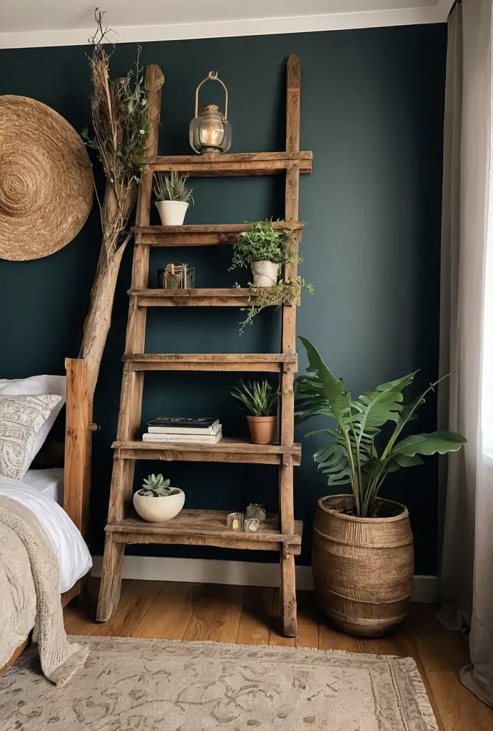 Lean a vintage wooden ladder against your bedroom wall. Use rungs to display throws, plants, or decorative objects.