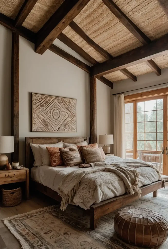 Wood beams create cozy intimacy in large bedroom spaces. They provide visual weight that grounds airy room designs.