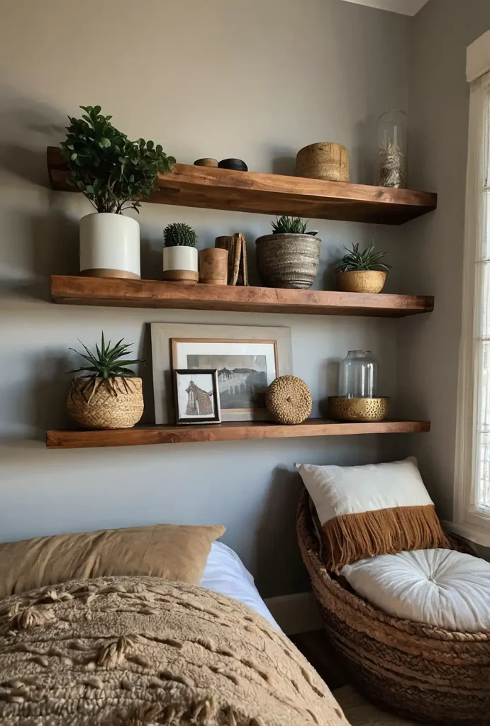 Install wooden floating shelves to display carefully curated neutral decor. Choose reclaimed or weathered wood finishes.